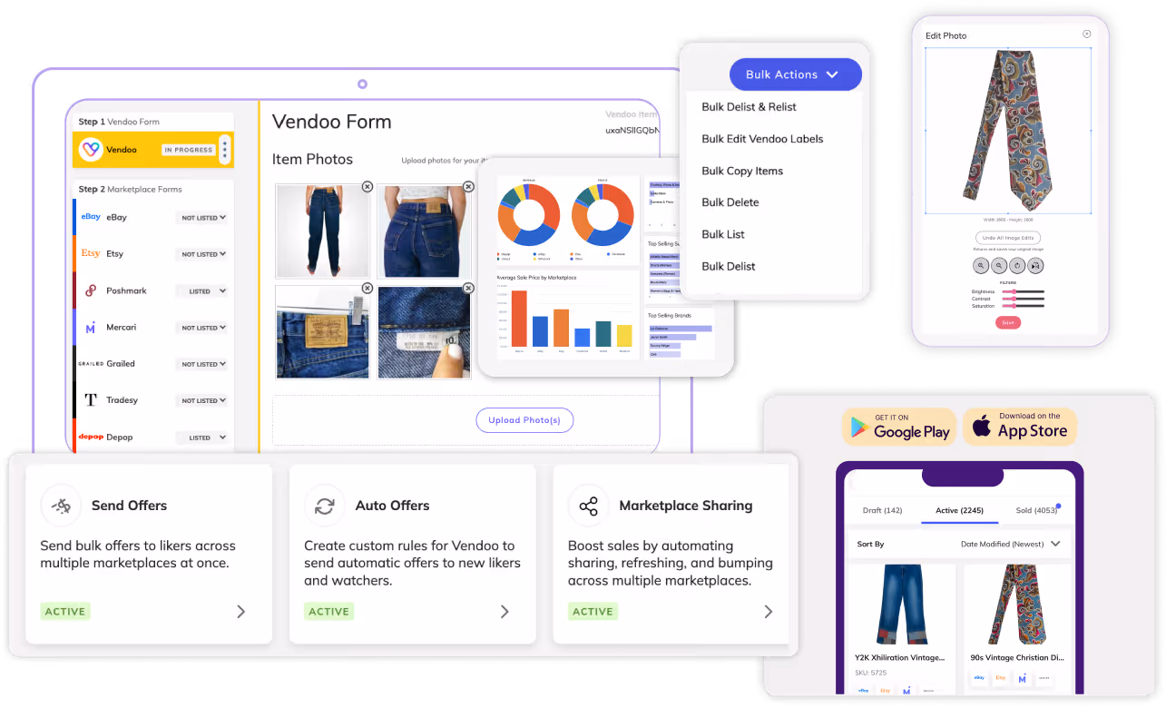 The Vendoo mobile app lets you manage your business on the go. You can create listings, crosslist, delist, and relist, mark items as sold, send offers, and access your inventory and analytics right from your phone on Apple and Android! 📱