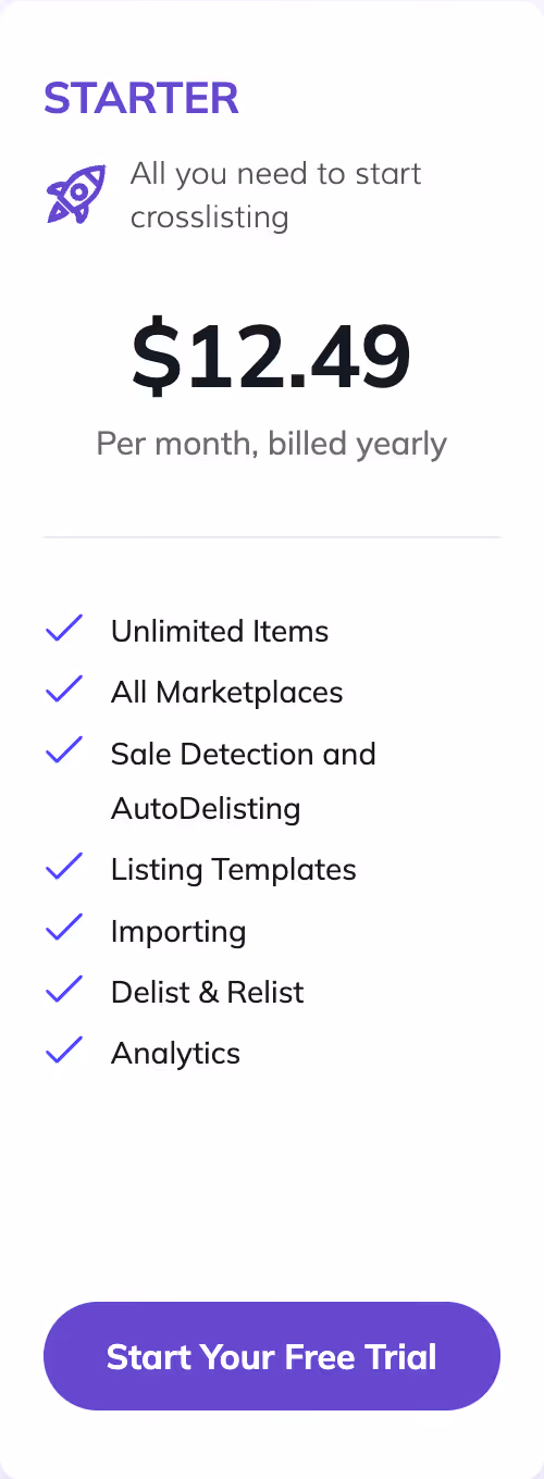 Vendoo is a Seller’s Best Friend! It’s an all-in-one reseller solution designed to help resellers. Vendoo helps you crosslist items to multiple marketplaces, manage inventory, automate tasks like Poshmark sharing and sending offers, and track performance with detailed analytics. Vendoo is the #1 crosslisting solution with the most tools and features and a wide range of marketplaces.