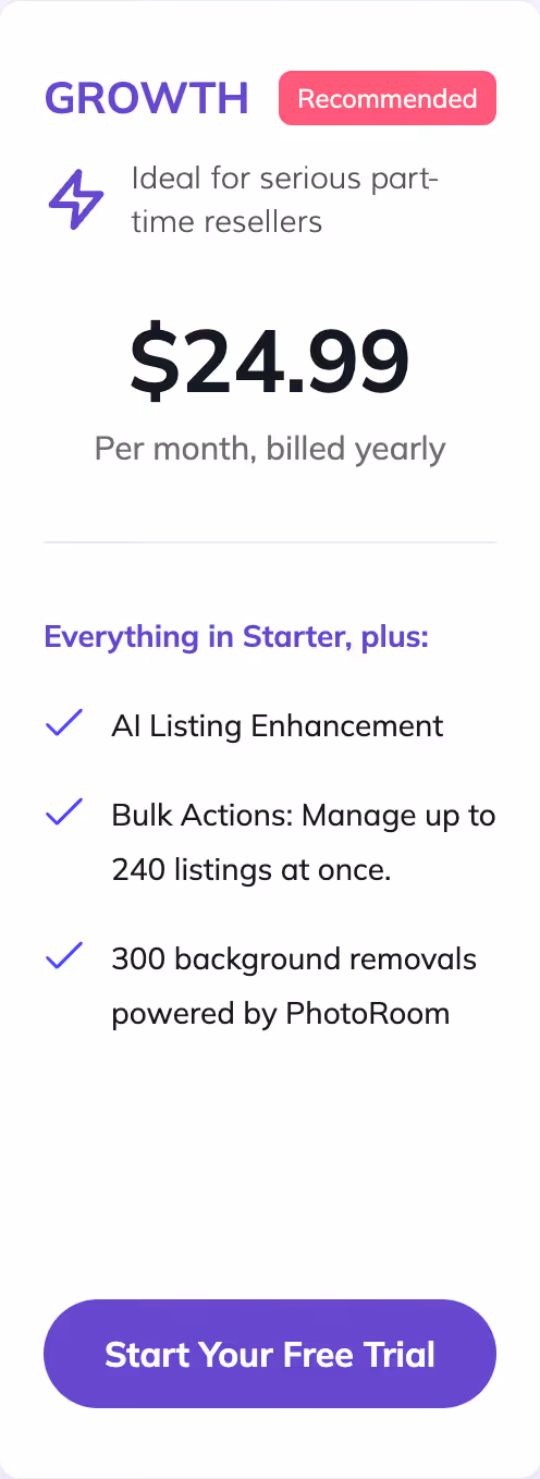 Streamline your process by listing faster and better. Use listing templates, default fields, and bulk photo editing with background removal powered by PhotoRoom.