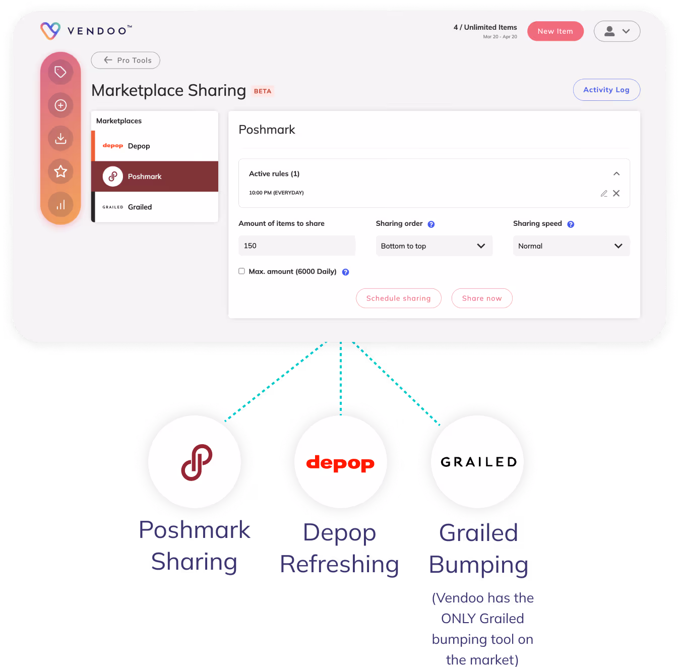 Vendoo is the only all-in-one tool that let’s you crosslist, manage your inventory, detect sales, send offers, and share items to keep them relevant in marketplace searches.