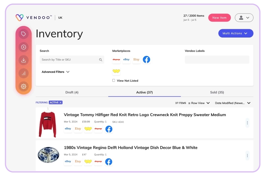 Reselling software can augment your Etsy shop by automating routine tasks and providing valuable insights into your sales performance. With Vendoo’s Etsy marketplace reselling platform, you can easily crosslist your products across multiple marketplaces, increasing your reach without additional effort. The software’s inventory management tools help you keep track of stock levels, preventing overselling and ensuring your listings are always up-to-date. The analytics offered by Vendoo enable you to understand customer behavior, identify trends, and make data-driven decisions to enhance your shop’s performance and boost your sales on the Etsy marketplace reselling software.