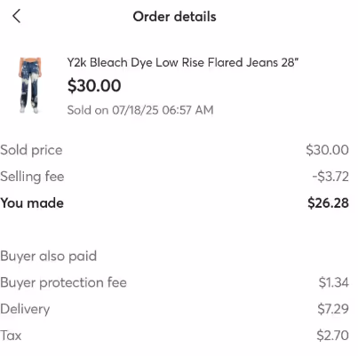 Consider a typical Mercari sale to see how fees add up. These jeans sold for $30. The total buyer cost is $41.33, and the seller's earnings are $26.28 (minus cost of goods to determine profit).