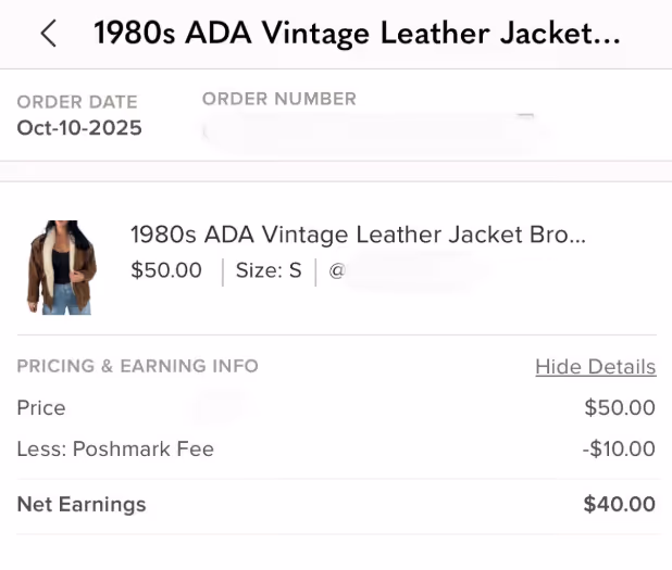 This jacket sold for $50. The Poshmark fee is $10, and the net earnings are $40 (minus the cost of goods to determine profit).