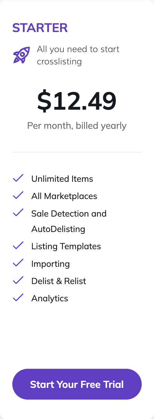 Vendoo is a Seller’s Best Friend! It’s an all-in-one reseller solution designed to help resellers. Vendoo helps you crosslist items to multiple marketplaces, manage inventory, automate tasks like Poshmark sharing and sending offers, and track performance with detailed analytics. Vendoo is the #1 crosslisting solution with the most tools and features and a wide range of marketplaces.
