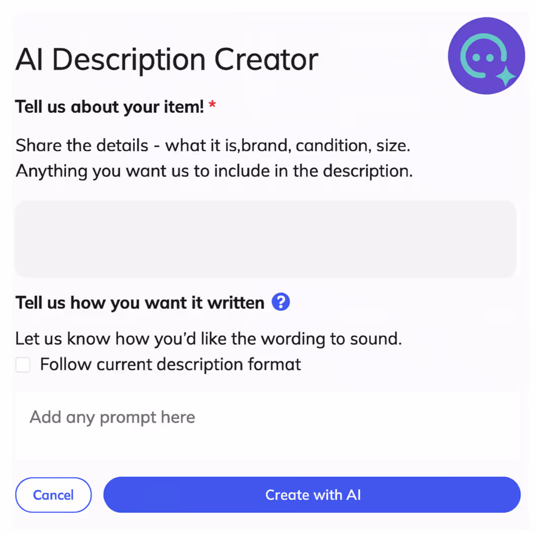 Create listings even faster with Vendoo’s AI Description Creator. Just enter a few key details and let AI generate the perfect item description — without changing your saved templates.
